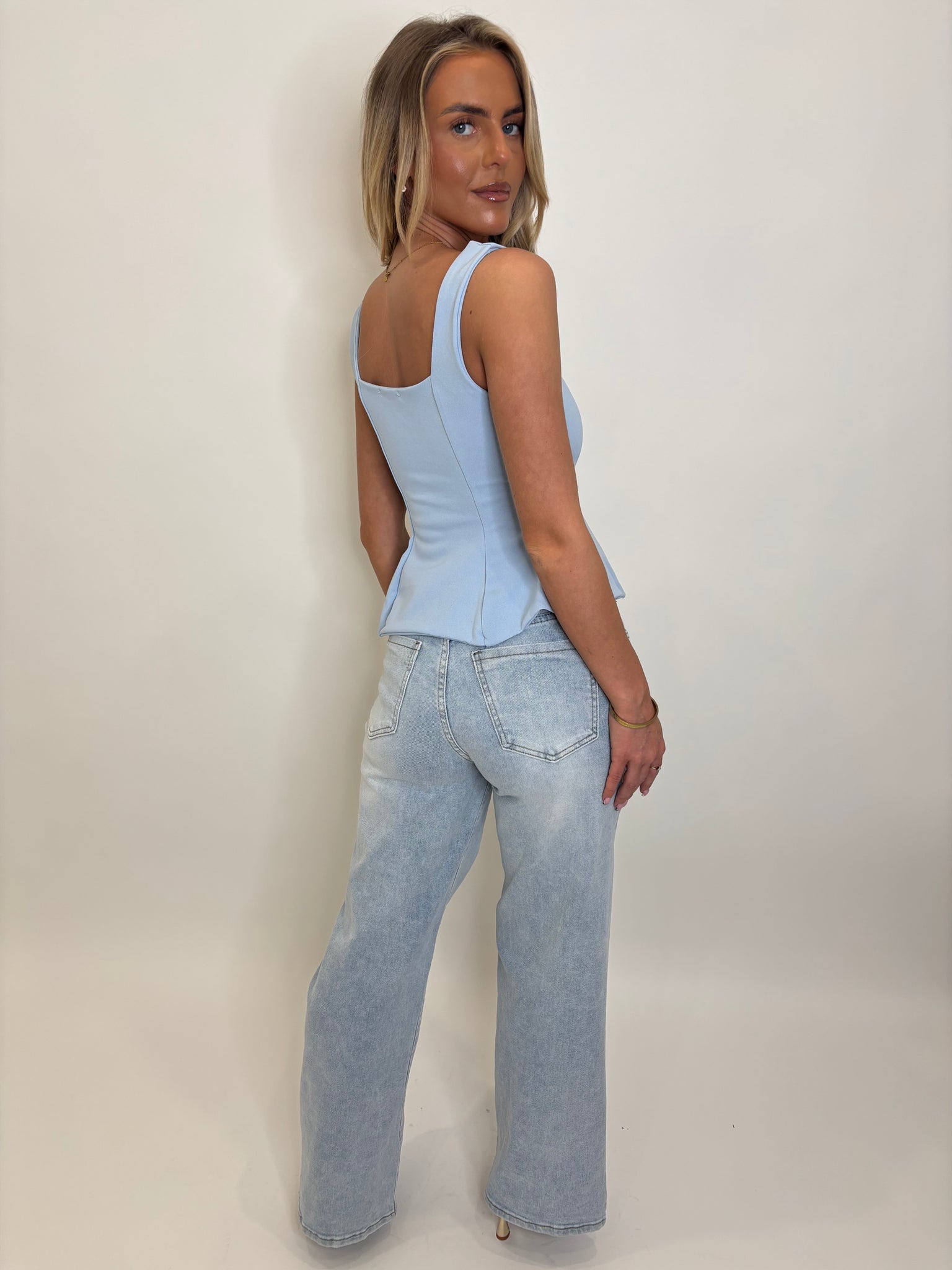 A sleeveless gold top designed with thick, structured straps and a flattering tailored fit. The silhouette skims the body beautifully, finishing with subtle fitted pleats at the hem for added shape and movement. Effortlessly elegant, it’s the perfect statement piece for both day and evening styling.