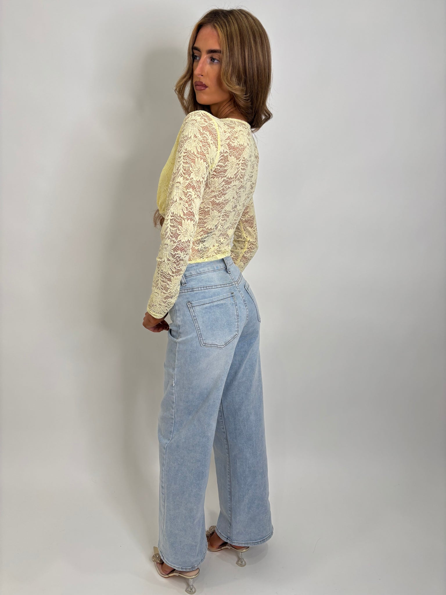A long-sleeve lace bodysuit featuring padded cups for support and shaping, adorned with elegant gold studs running down the front for a bold, sophisticated accent. The delicate lace fabric creates a feminine, flattering silhouette, making this piece both sexy and refined.