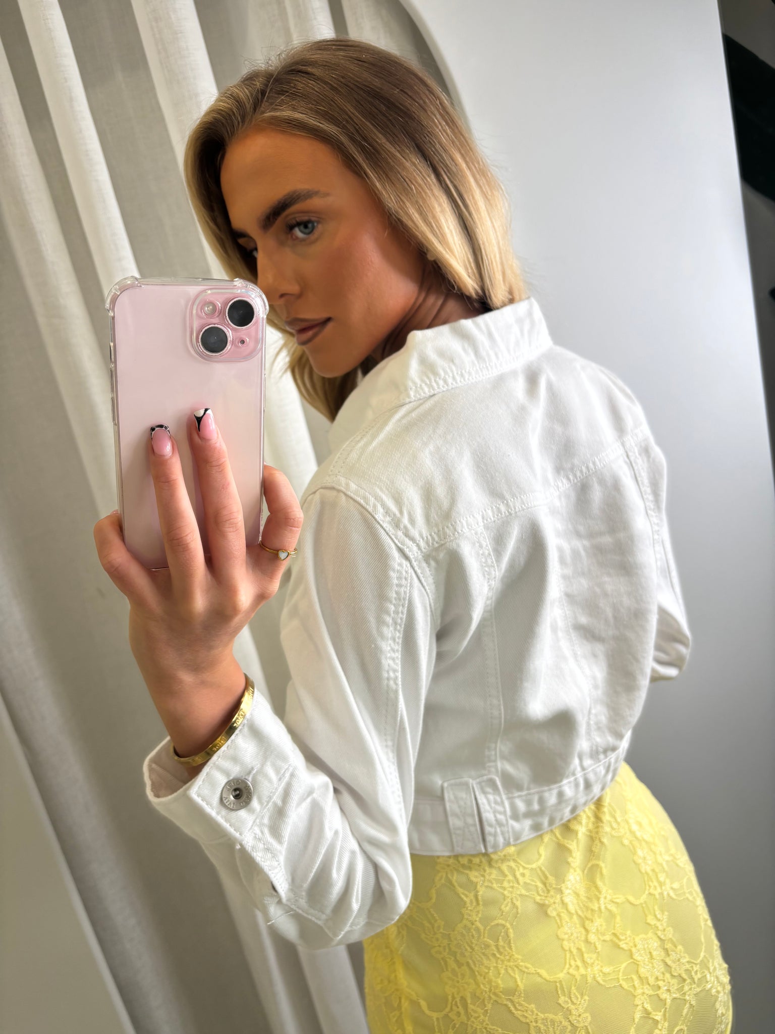 A timeless white denim jacket featuring a classic button-up front, structured collar, and durable denim fabric. Perfect for layering, it adds a clean and effortless touch to any outfit. Designed with front button fastening and functional pockets for a stylish yet practical finish.