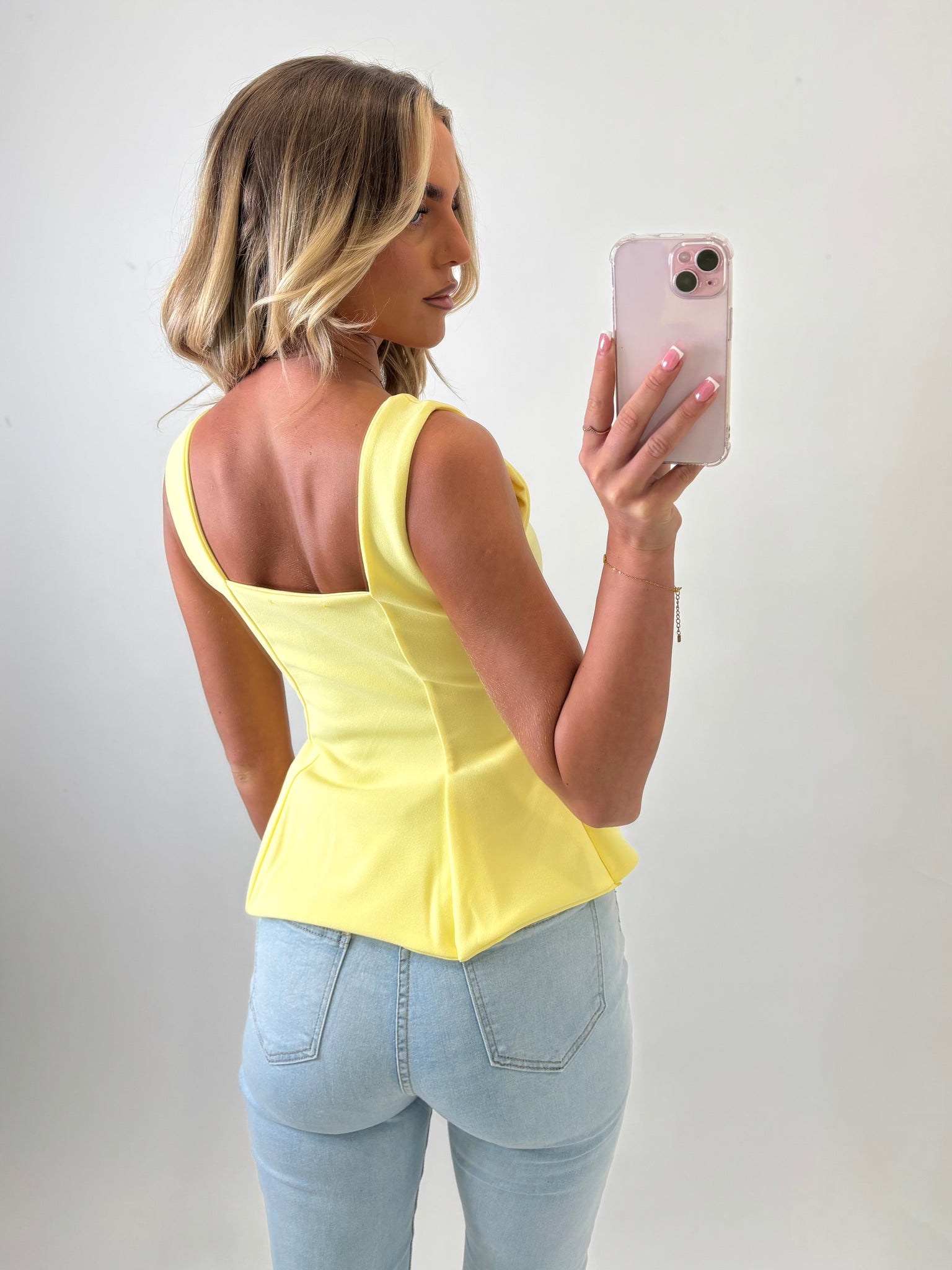 A sleeveless gold top designed with thick, structured straps and a flattering tailored fit. The silhouette skims the body beautifully, finishing with subtle fitted pleats at the hem for added shape and movement. Effortlessly elegant, it’s the perfect statement piece for both day and evening styling.