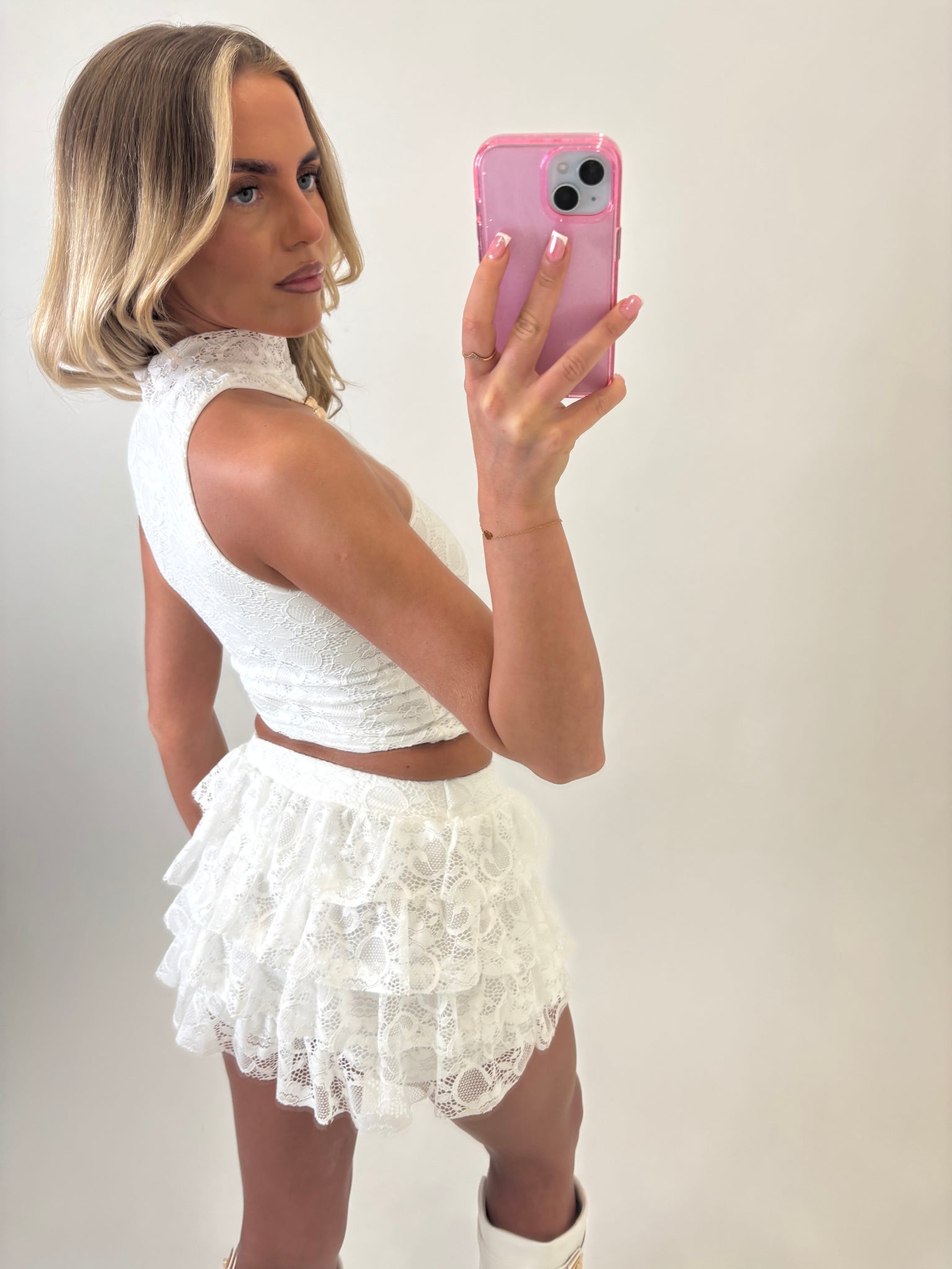 This co-ord set features a sleek, fitted halter-style crop top with a high neckline and statement ring detail at the center, creating a flattering, sculpted silhouette. The top is paired with a matching mini skirt designed with soft, layered ruffles that add movement and a feminine touch. The overall look is chic and dressy, combining structured elegance with playful texture—perfect for a night out or a stylish event.