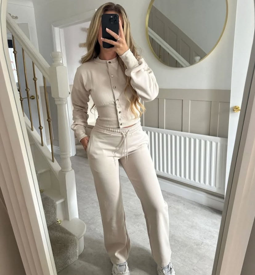 Fitted lounge co-ord set featuring a structured, cropped button-front top with long sleeves and a flattering cinched waistband. Paired with matching high-waisted joggers designed with an elasticated drawstring waist and relaxed straight-leg fit. Crafted from soft, comfortable fabric that contours the body while offering all-day ease. Perfect for elevated off-duty styling, casual outings, or travel days.