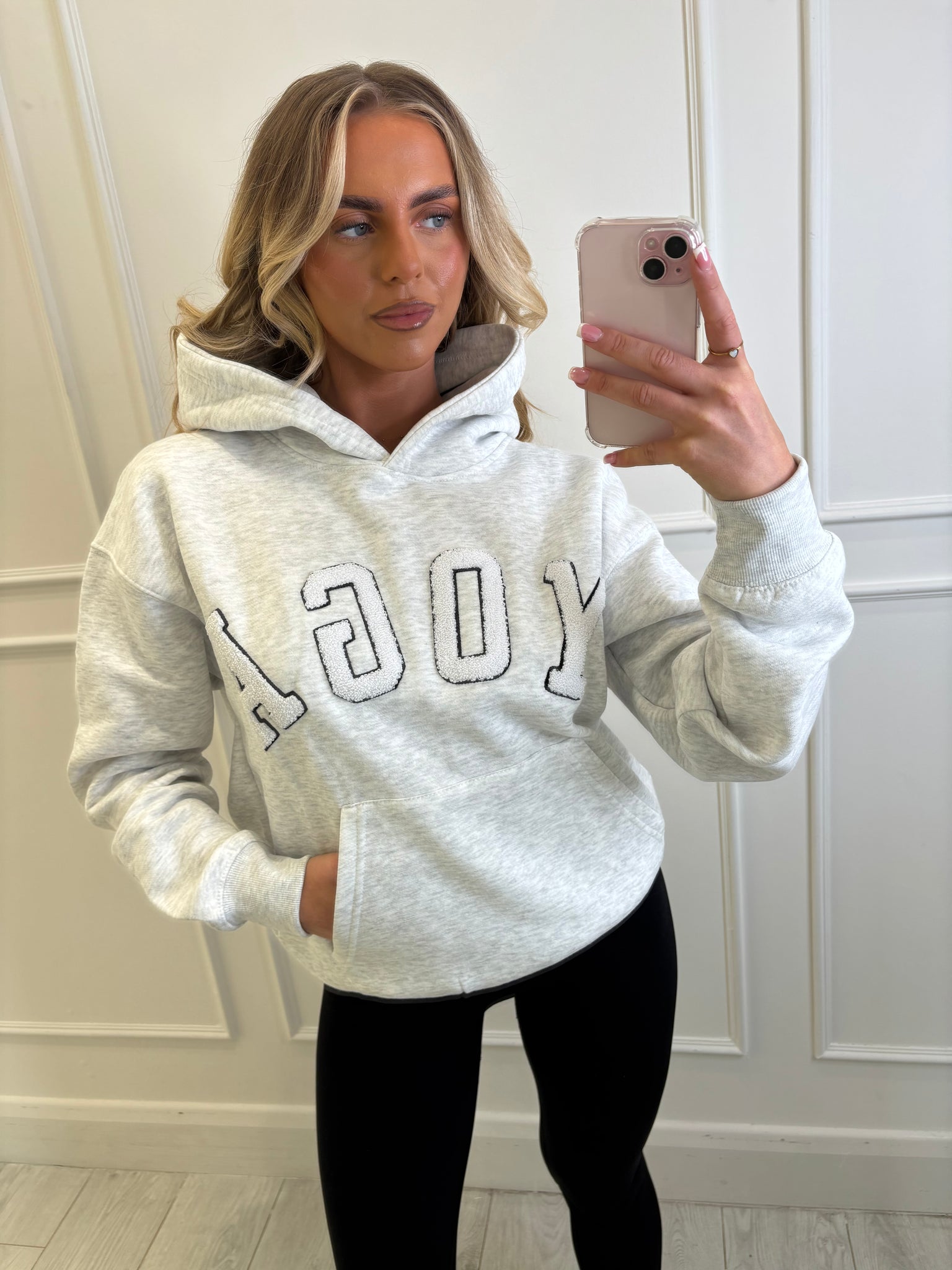 Grey hoodie with “Yoga” in soft, fluffy lettering on the front. Made from comfortable fabric with a relaxed fit, it’s easy to wear and perfect for everyday comfort and style.