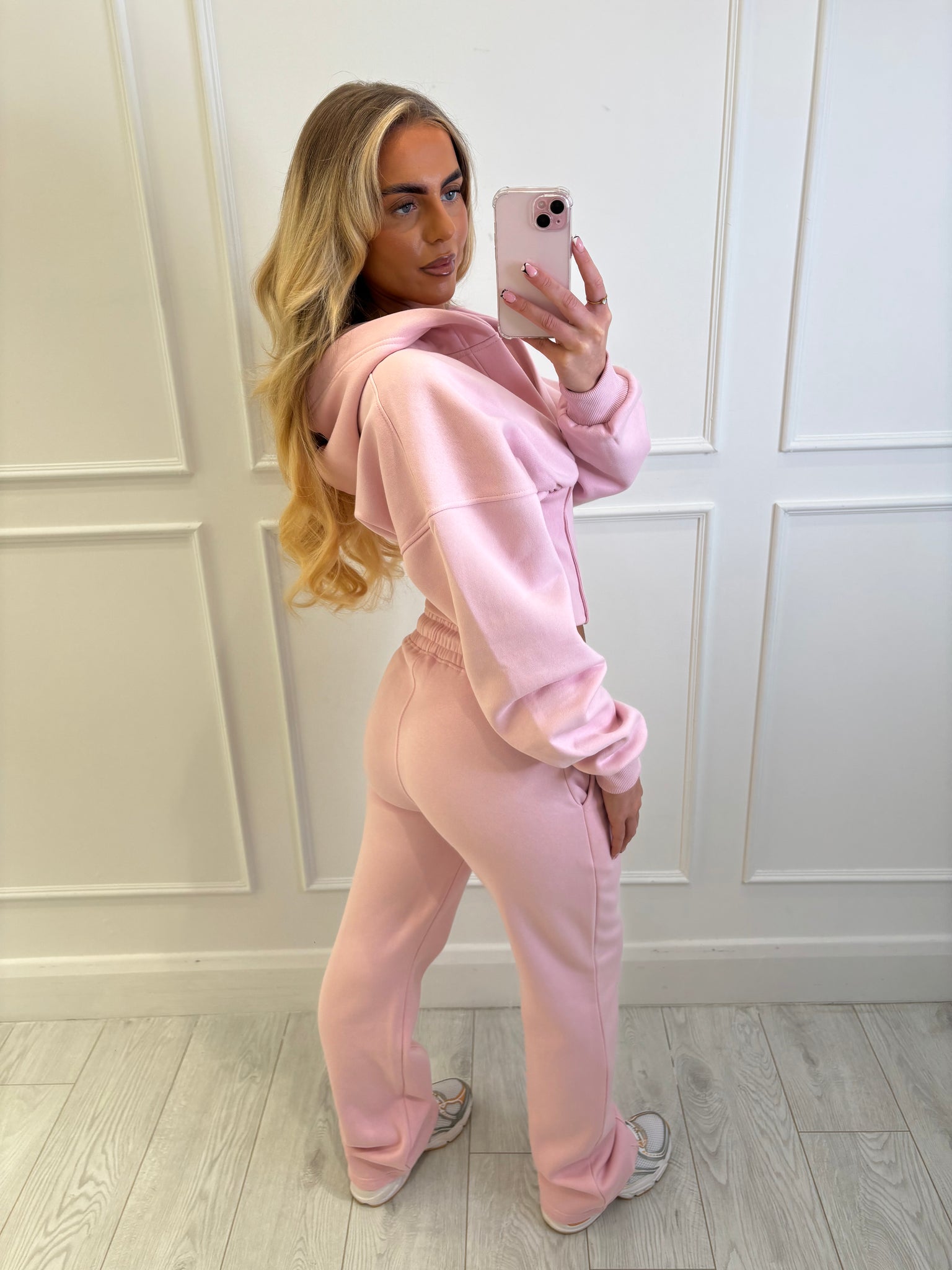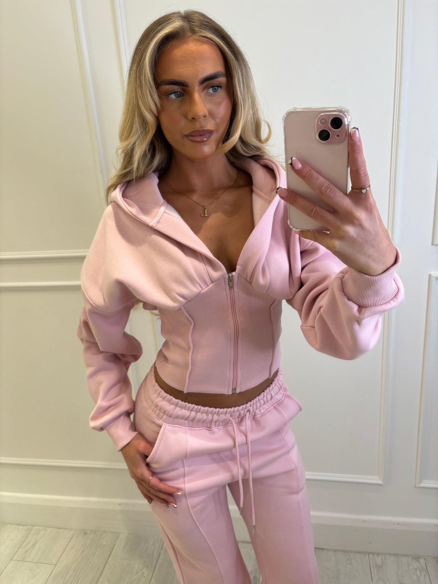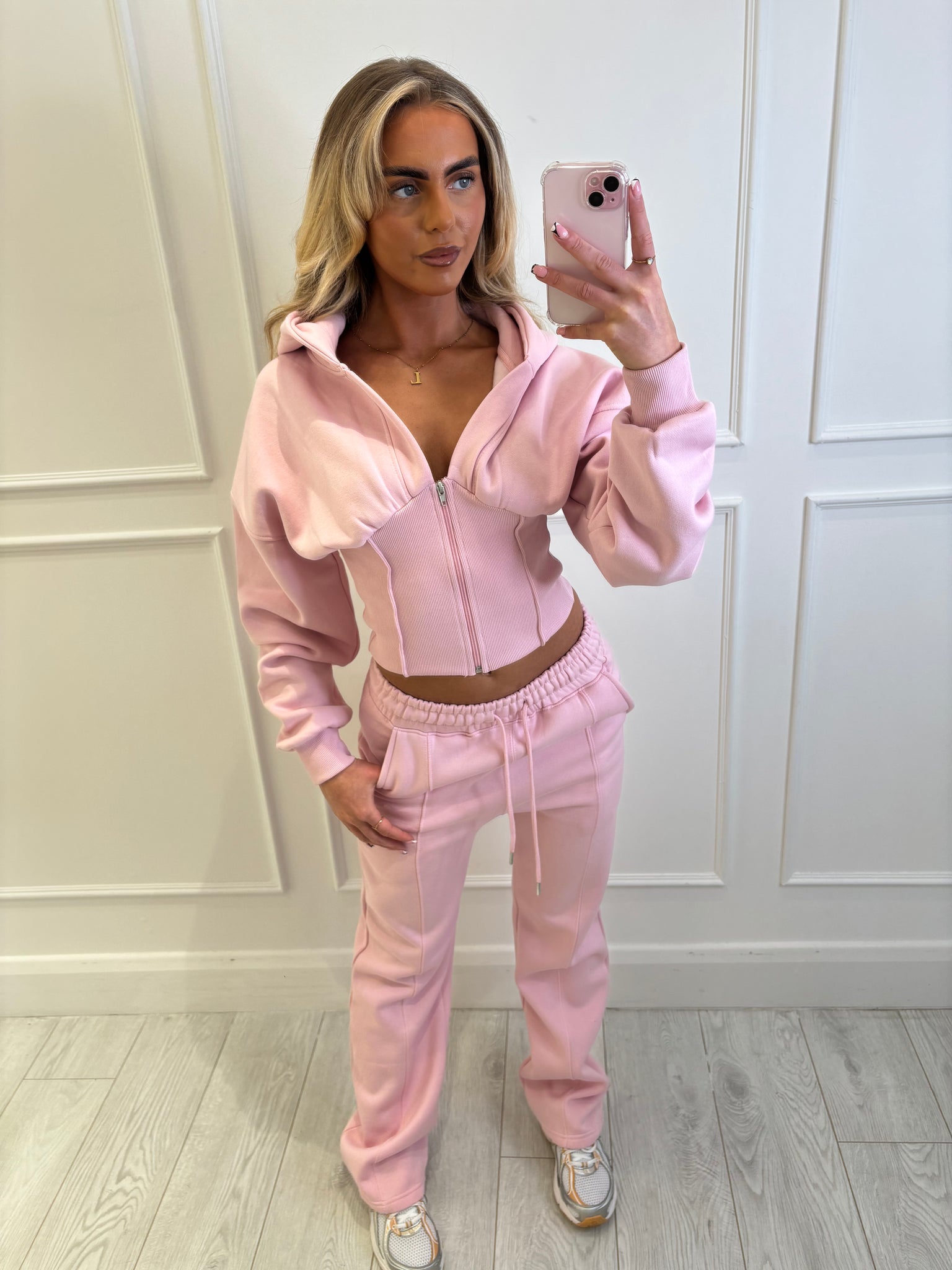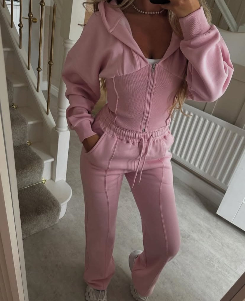 Chic and effortless, this two-piece set features a structured zip-front hoodie with contour detailing for a sculpted fit, paired with high-waisted joggers with an elasticated drawstring waist. Designed in a soft, premium-feel fabric, it’s the perfect blend of comfort and style for everyday wear.