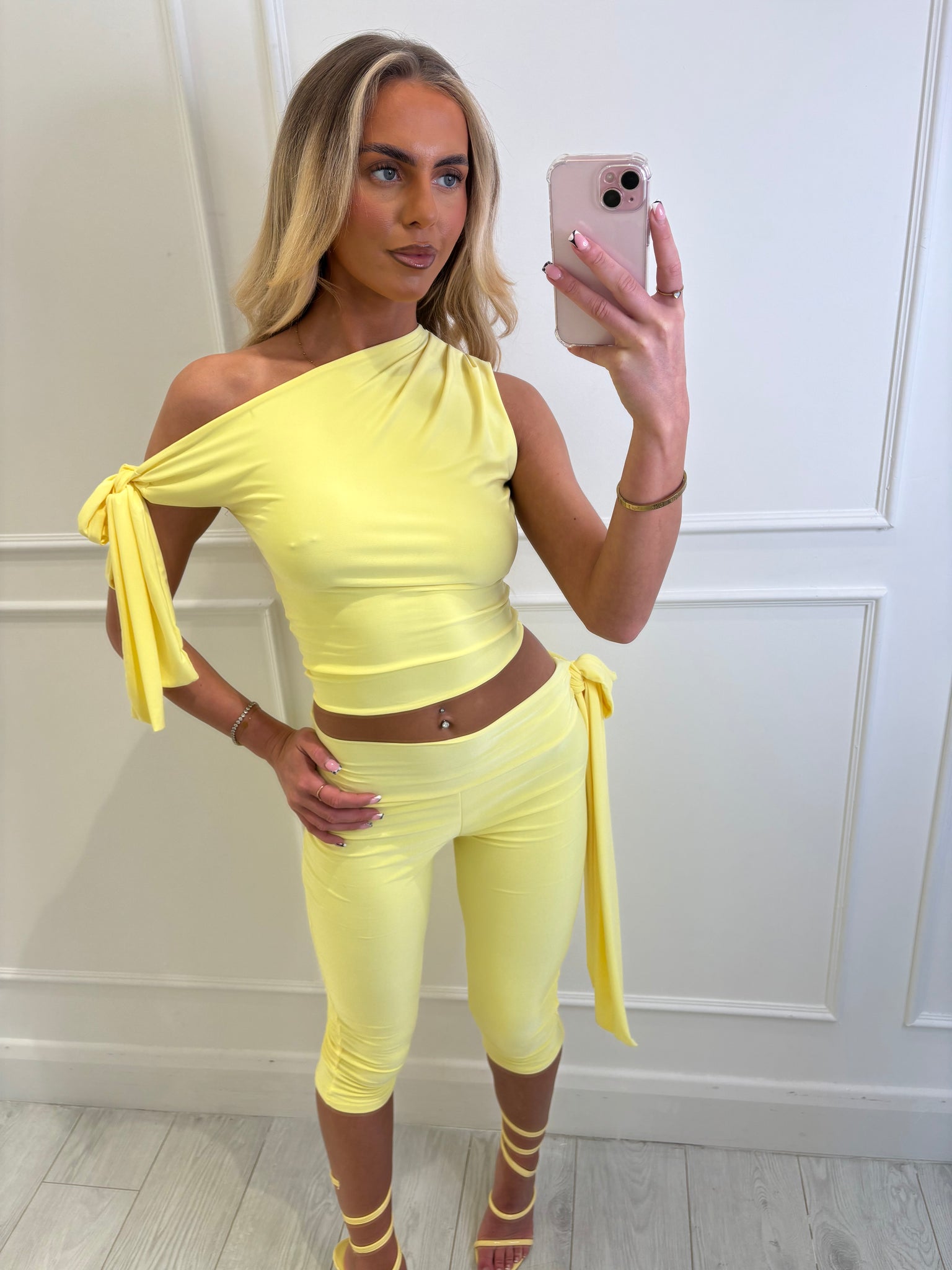 Turn heads in this sleek and flattering two-piece co-ord set, designed to sculpt and enhance your silhouette. The asymmetric one-shoulder top features a stylish tie detail on the sleeve, adding a feminine and elegant touch. Paired with high-waisted, figure-hugging capri leggings with a chic side tie detail, this set creates a perfectly balanced, statement look.