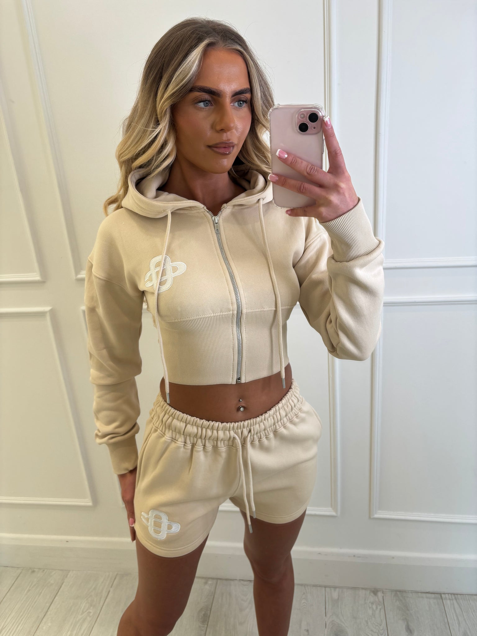 A fitted shorts co-ord set featuring a cropped zip-up hoodie and high-waisted shorts. The hoodie has a structured, contouring fit with ribbed detailing, a full-length zip, and an adjustable drawstring hood. The matching shorts sit comfortably at the waist with an elasticated band and drawstring for a secure fit, offering a flattering, sculpted silhouette.