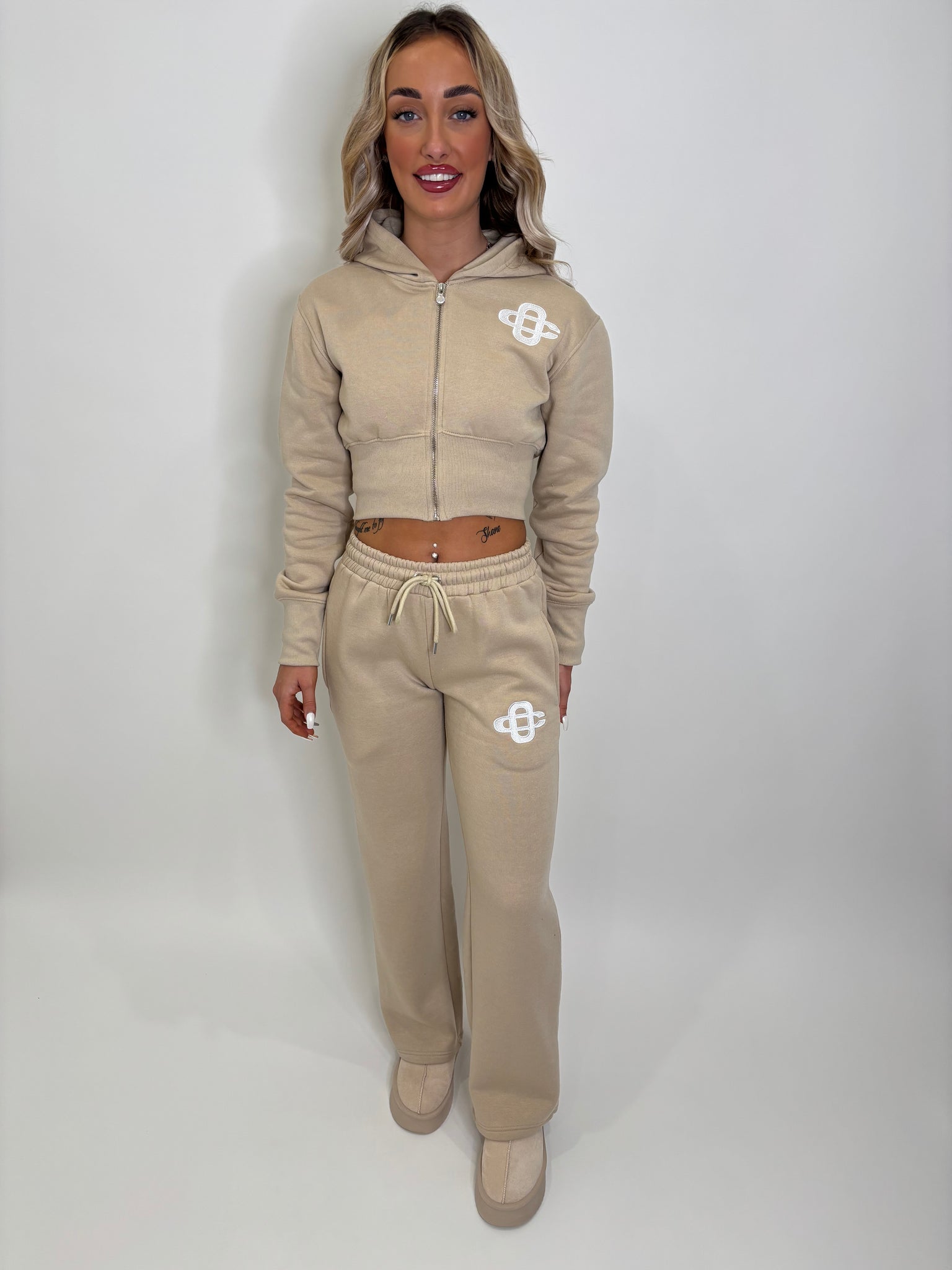“A super cozy co-ord featuring a cropped zip-up hoodie paired with relaxed, wide-leg joggers. The set has a soft, loungewear feel with a flattering fit, finished with bold logo detailing on both the hoodie and joggers.
