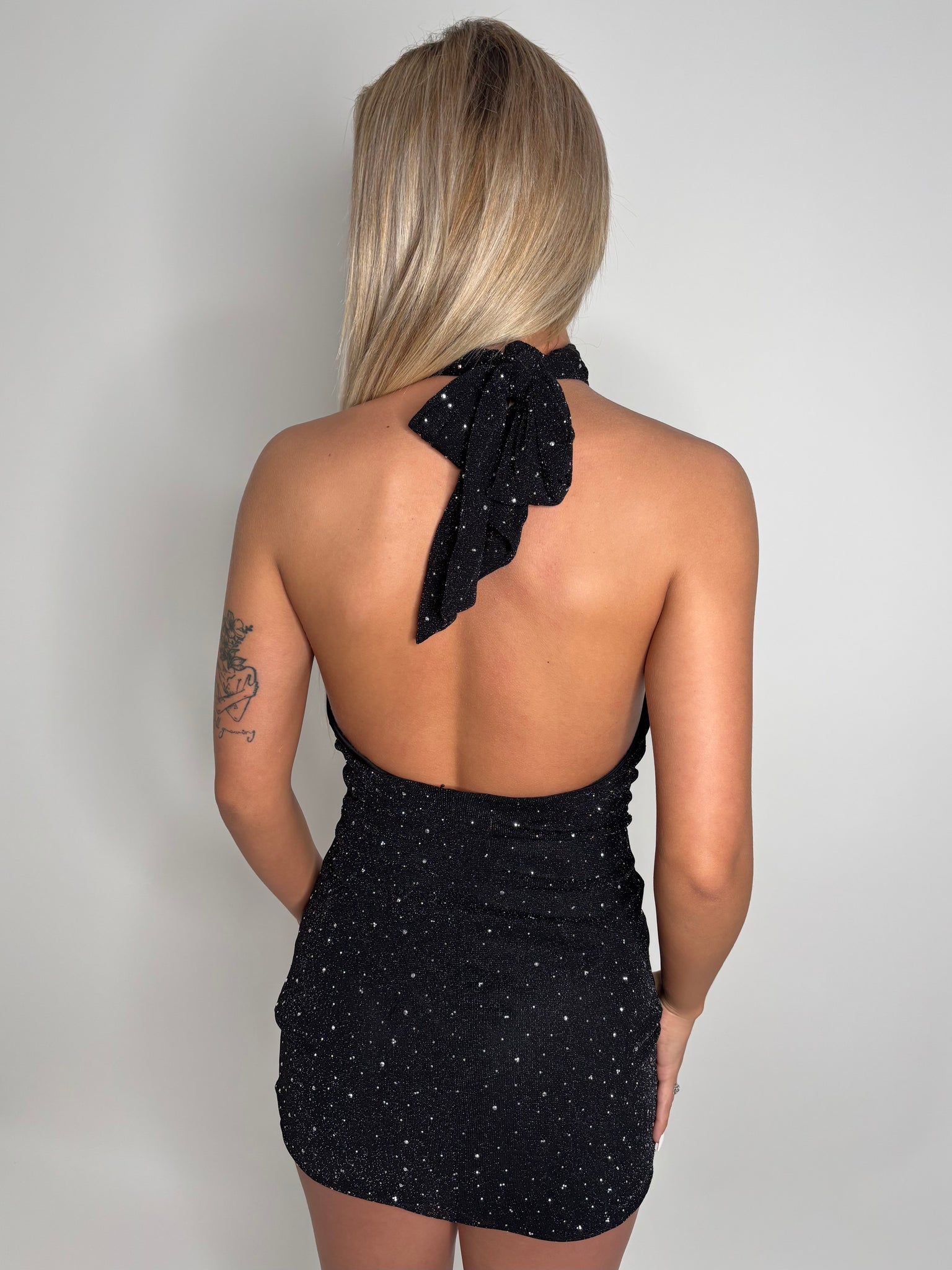 Shine effortlessly in this stunning halterneck mini dress, adorned with sparkling rhinestones from top to hem.