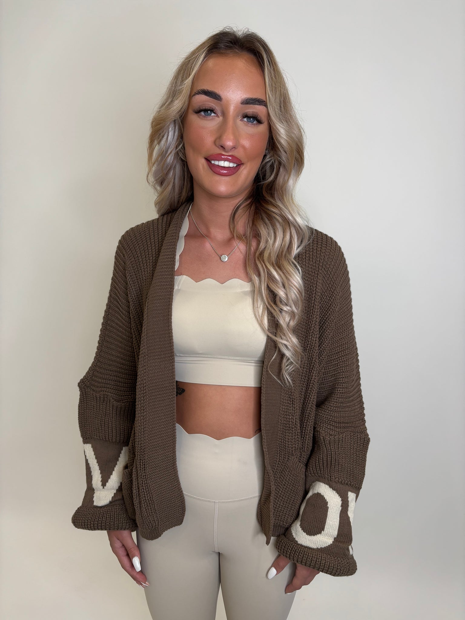 A cozy, open-front knitted cardigan featuring a relaxed, slouchy fit and wide sleeves for a comfortable, laid-back look. The sleeves display bold “LOVE” lettering, adding a playful and stylish touch. Perfect for layering over casual outfits, this cardigan blends softness, texture, and statement detailing for an effortlessly chic vibe.