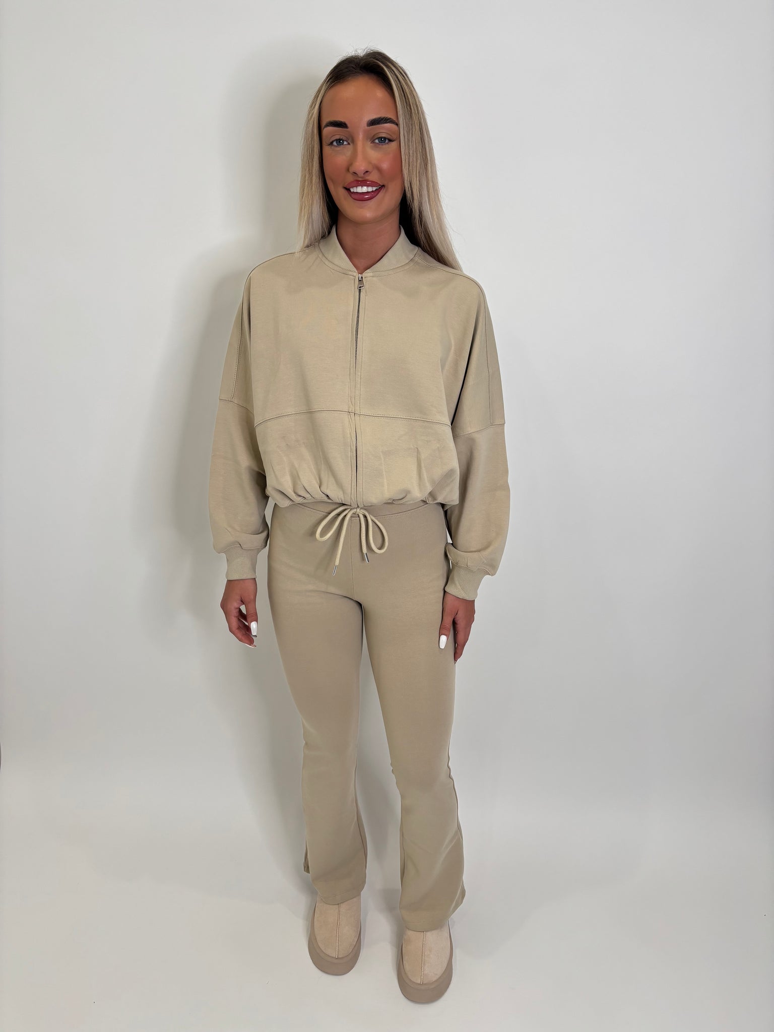 A sleek and effortless co-ord set designed for everyday comfort with a flattering silhouette. The zip-up top features a relaxed fit with an adjustable drawstring hem, paired with soft, high-stretch trousers that gently flare at the bottom for a balanced, streamlined look.