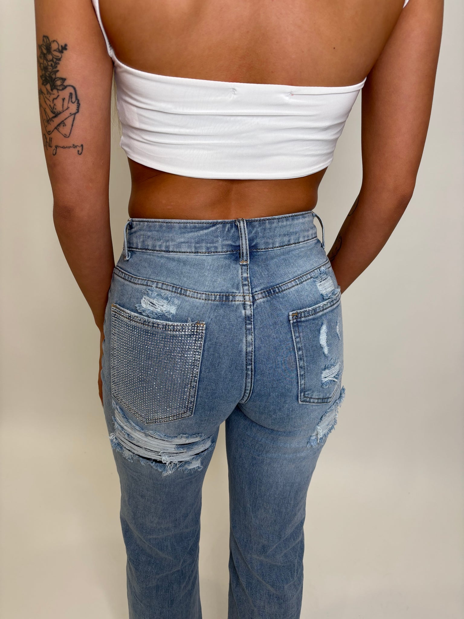 Turn everyday denim into a statement piece with these standout jeans, featuring a sparkling rhinestone back pocket and playful rips just under the bum for a flirty, modern twist. The classic fit meets bold detailing, creating a perfect balance of casual cool and glamorous edge.