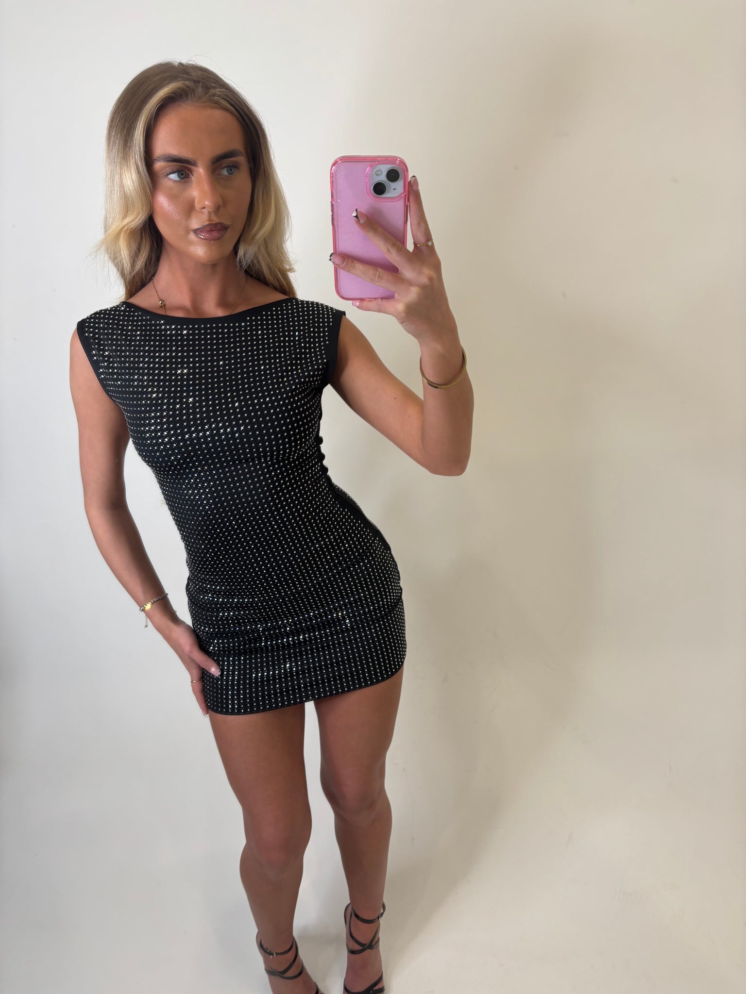 A backless mini dress adorned with shimmering rhinestones for a show-stopping finish. Designed to contour your figure, it catches the light from every angle while the open back adds a striking, elegant touch. The ultimate statement piece for unforgettable nights.
