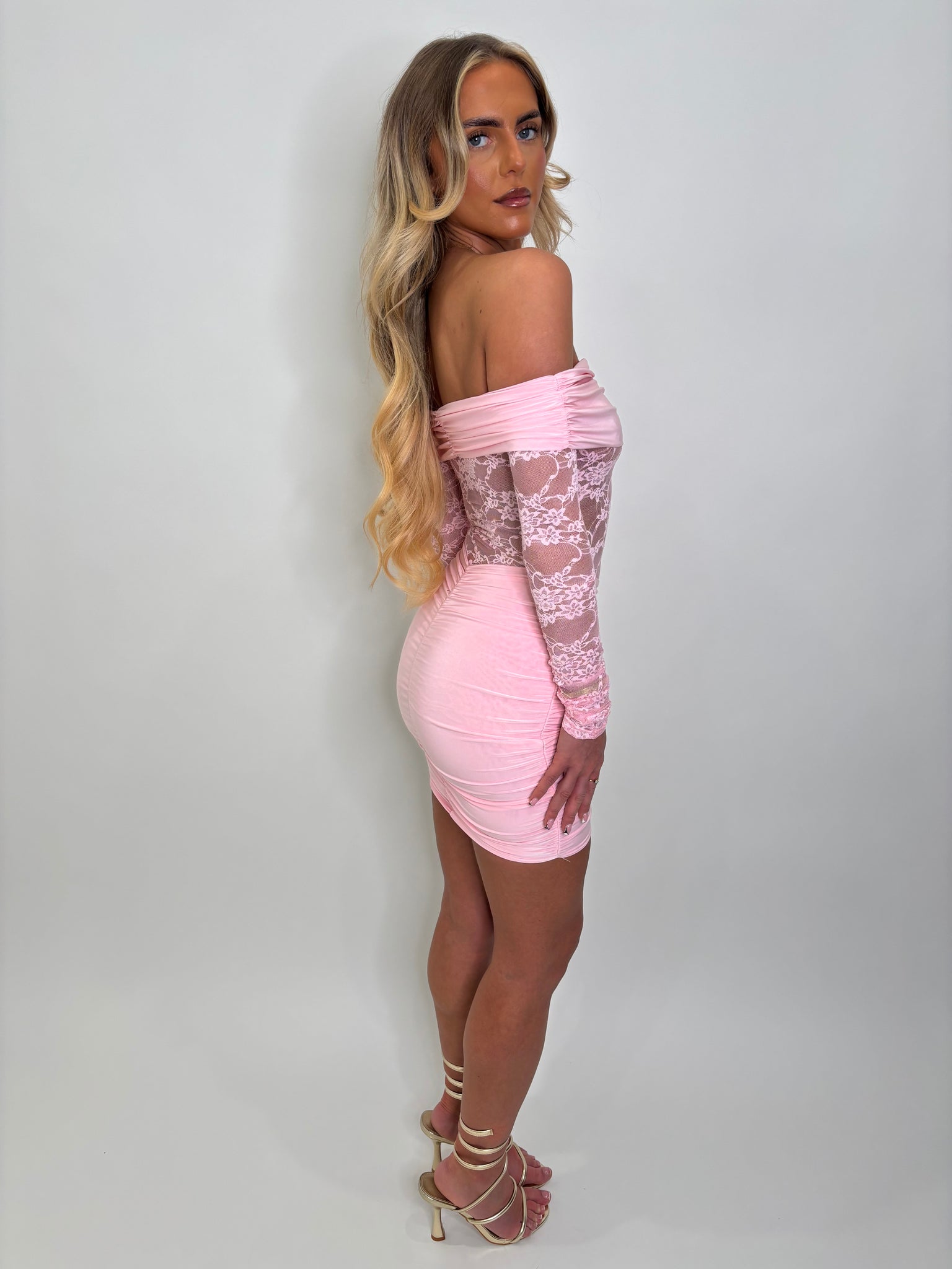 A flattering off-shoulder mini dress designed to sculpt your silhouette. Featuring a ruched bandeau neckline, sheer lace bodice with long fitted sleeves, and a body-hugging ruched skirt, it enhances your shape in all the right places.