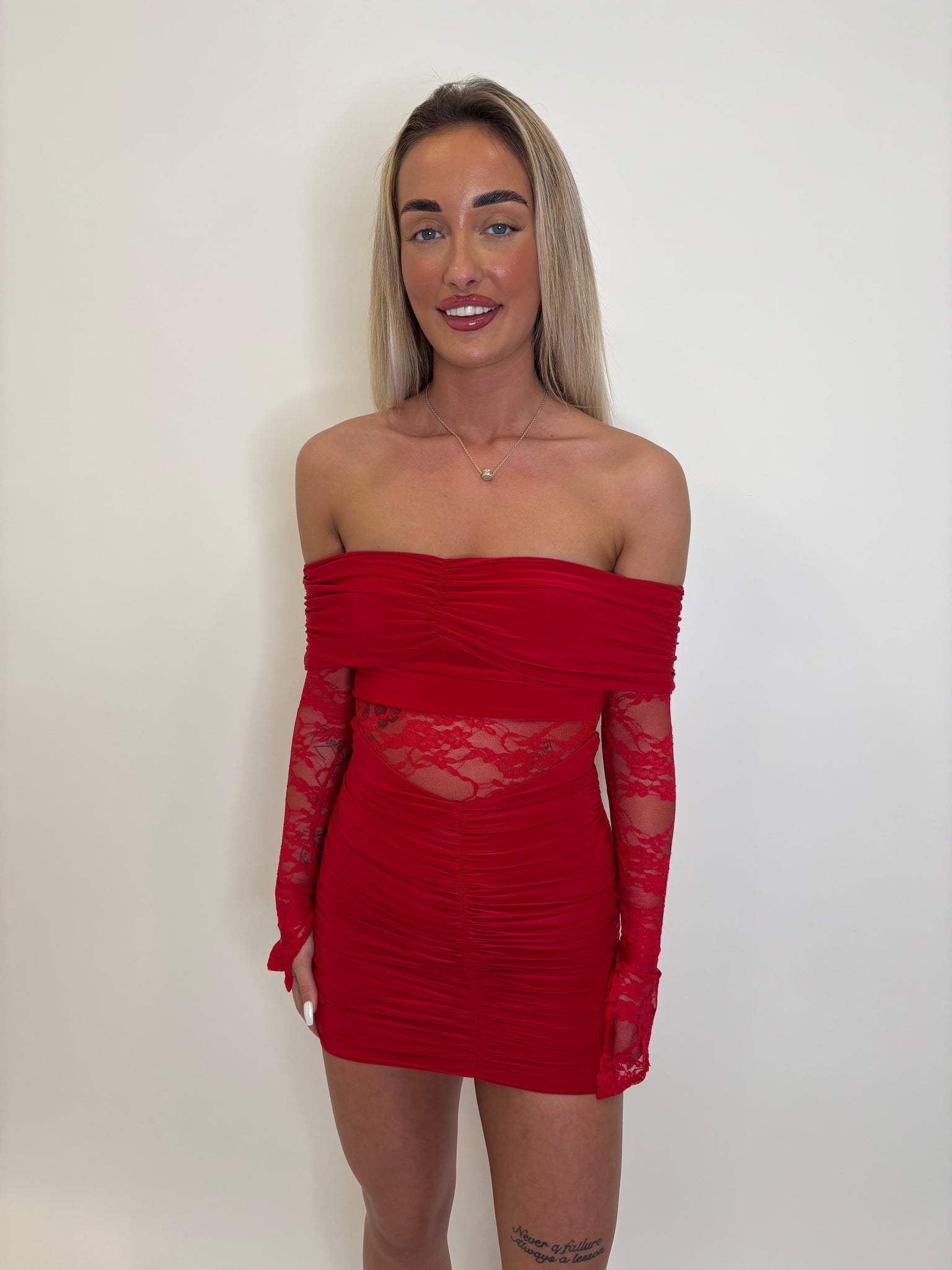 This elegant off-the-shoulder mini dress features a beautifully ruched body that enhances the silhouette while offering a flattering, sculpted fit. Delicate lace panels at the sleeves and waist create a striking sheer contrast, adding a touch of sophistication and texture. Finished with long, subtly flared lace sleeves and a gently draped neckline, this dress is designed to make a statement with its blend of femininity and modern glamour.