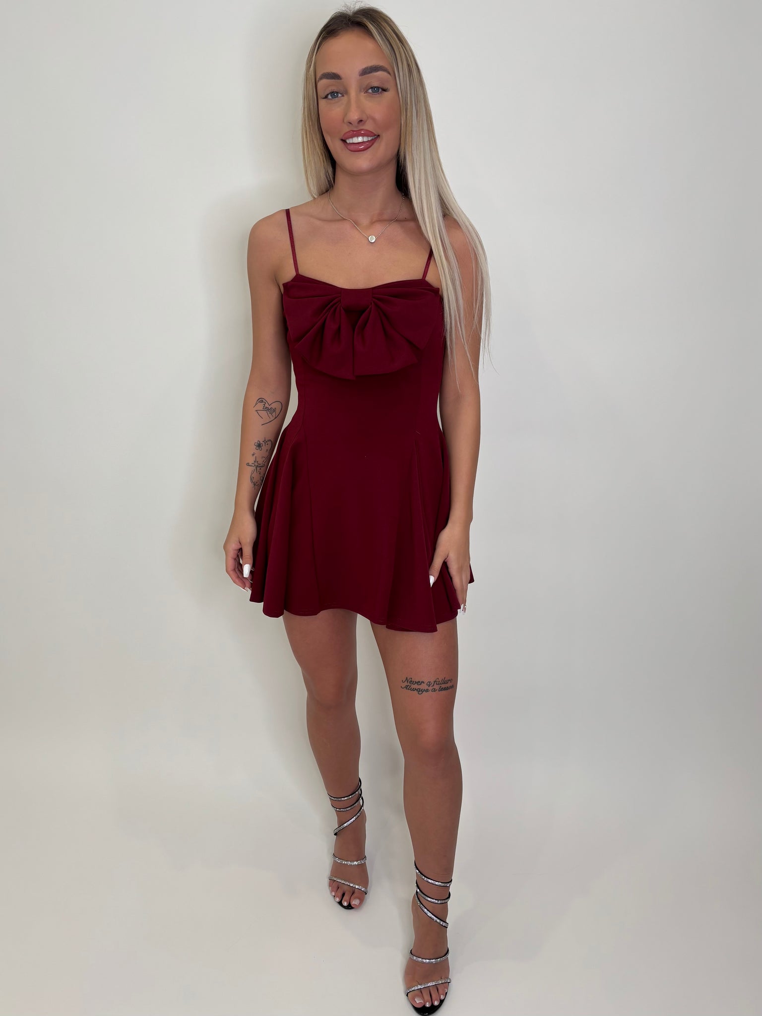 Turn heads in this stunning red mini dress, featuring a flattering flowy skirt that moves beautifully with every step. The statement oversized bow at the front adds a bold, feminine touch, while the fitted bodice and delicate straps create a chic, figure-enhancing silhouette.